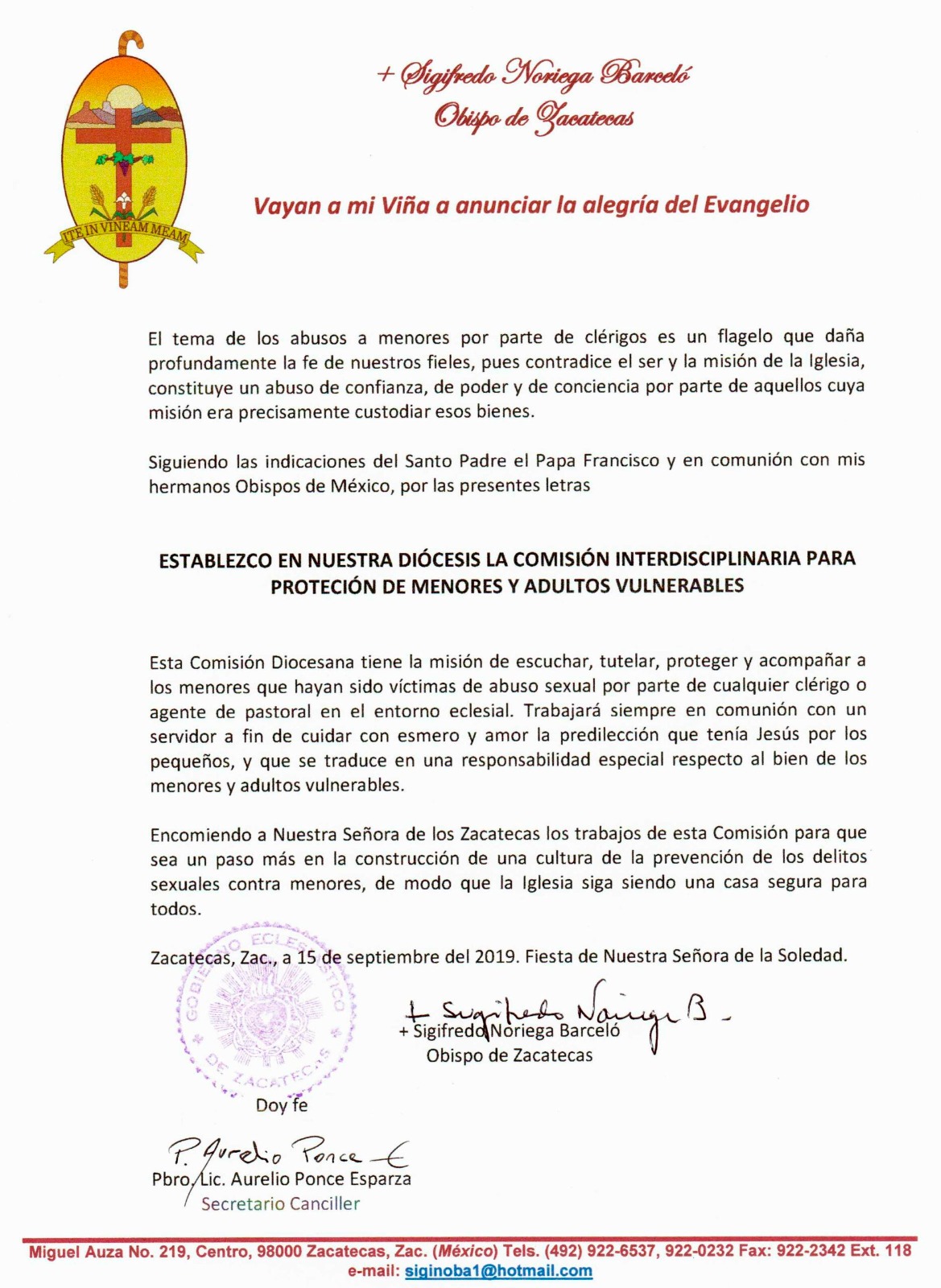 Nuestro Obispo, Don Sigifredo Noriega Barceló, preocupado y ocupado en el tema, siguiendo las orientaciones del Santo Padre, ha decidido establecer en nuestra Diócesis de Zacatecas la Comisión Diocesana para la tutela de menores y adultos vulnerables.